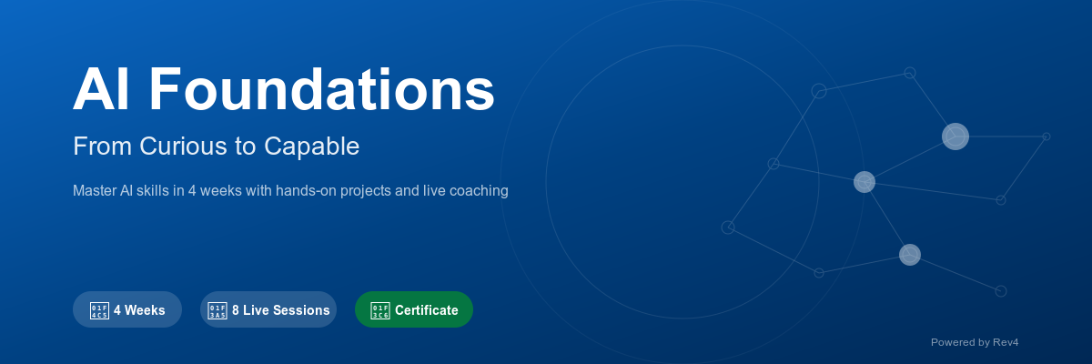 A 4-week cohort program taking participants from AI-aware to AI-using. Includes 8 live sessions, homework assignments, community forums, and a final portfolio.
